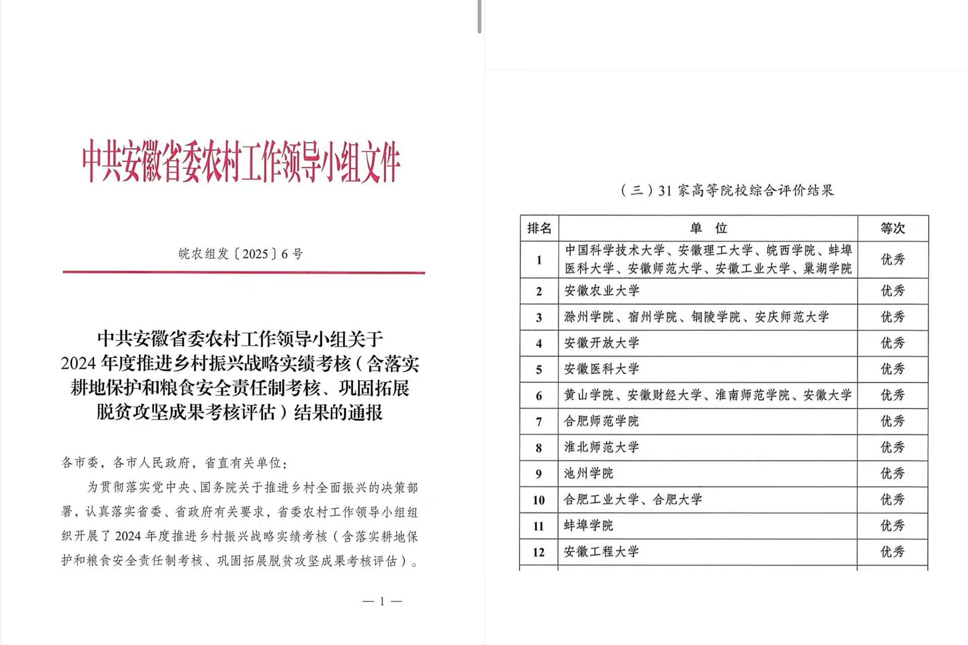 近日,安徽省2024年度推进乡村振兴战略实绩考核(含落实耕地保护和粮食安全责任制考核、巩固拓展脱贫攻坚成果考核评估)结果公布,巢湖学院获得安徽省2024年度推进乡村振兴战略实绩考核(巩固拓展脱贫攻坚成果考核评估)优秀等次,与中国科学技术大学、安徽理工大学、皖西学院、蚌埠医科大学、安徽师范大学、安徽工业大学等6所高校并列第一。