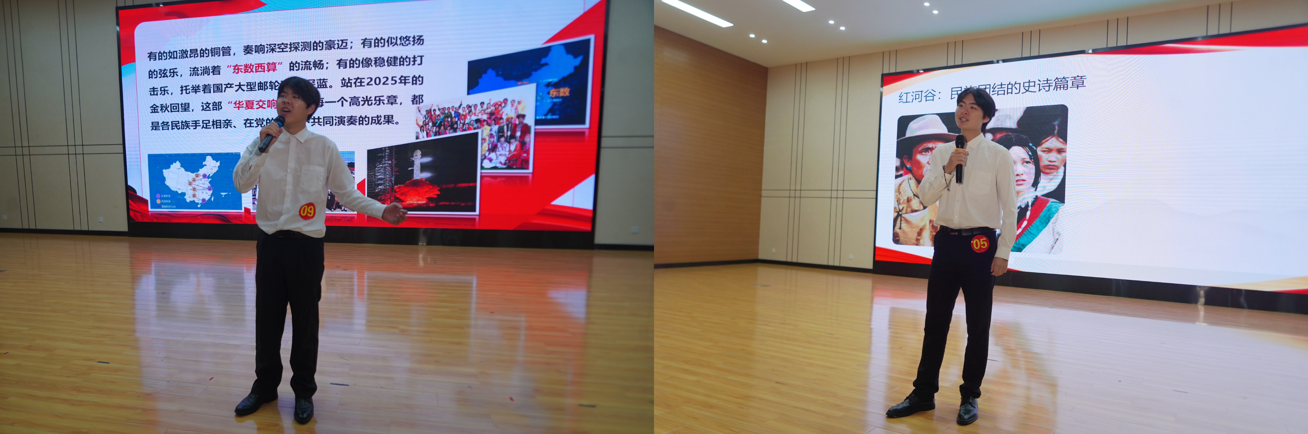 决赛现场,我校黄佳佳同学以《同谱华夏交响乐共筑团结新篇章》为题,结合自己所学专业,把国家的发展比作一部恢弘的交响乐,56个民族是其中不可或缺的声部,每个人都是新时代“交响乐”的演奏者。他认为,铸牢中华民族共同体意识,不是遥远的口号,而是每个人演奏好每一个音符的责任——既要守护好自己民族的独特音色,也要学会与其他“声部”和谐共鸣。肖炳祥同学则以一部历史电影《红河谷》为切入点,结合巢湖以展演融多俗、景区传认同、社区创示范,绘就民族团结盛景的鲜活事例,阐述了民族团结不仅是中华民族千百年来的精神财富,更是国家繁荣昌盛的稳固基石,各民族要像石榴籽一样紧紧相依。经过激烈角逐,最终,我校黄佳佳、肖炳祥2位同学分别荣获特等奖(全场唯一)、二等奖的好成绩,充分展现了我校学子优良的综合素养和昂扬的精神风貌,更体现了新时代青年深厚的家国情怀,赢得了评委与观众的广泛共鸣和认可。