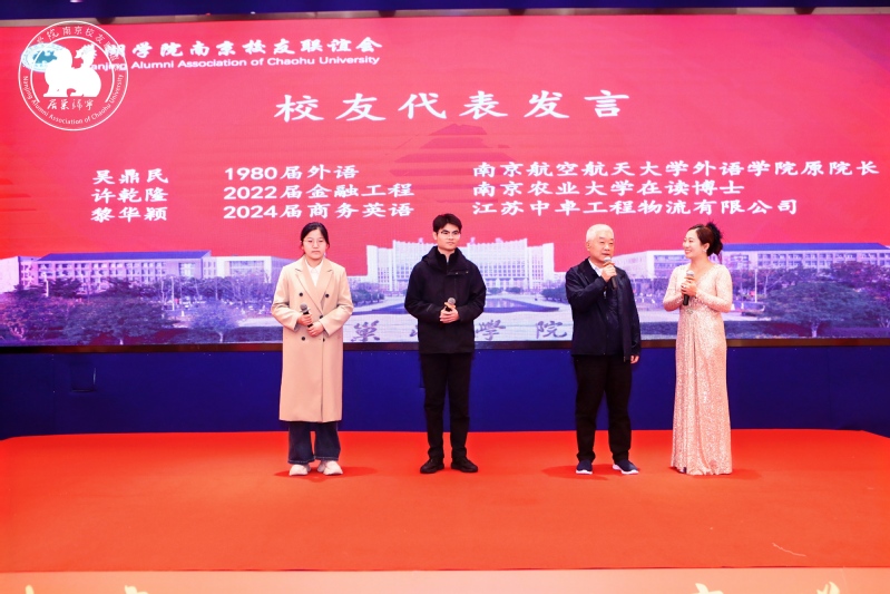 在随后的校友代表分享环节,南京航空航天大学外语学院原院长、1979届英语专业校友吴鼎民,南京农业大学在读博士、2022届金融工程专业校友许乾隆,江苏中卓国际物流有限公司职员、2024届商务英语专业校友黎华颖三位校友结合自身经历,深情回忆母校岁月,尽管年级不同、行业各异,但“巢院人”的共同身份让大家瞬间拉近了距离。会场内始终洋溢着温馨、热烈、感人的气氛。