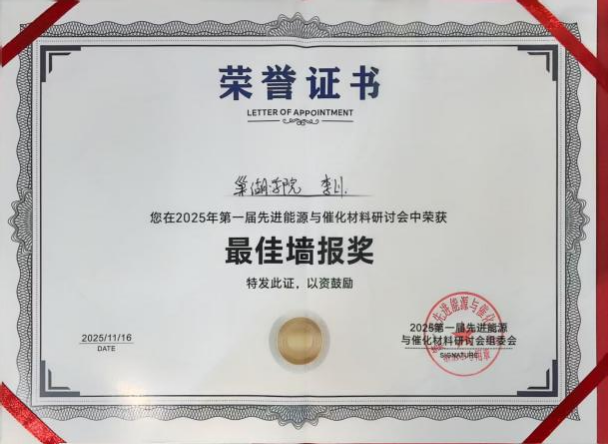 本次研讨会以“共探绿色能源新未来”为主题,聚焦储能技术、催化材料等能源领域关键方向,汇聚国内外顶尖专家学者,共同探讨能源材料与催化科学的前沿进展与发展方向。会议搭建多元化交流平台,设置能源存储技术与材料、能源转换催化、新型催化材料设计、化石能源与低碳催化及前沿表征与理论计算五大核心议题。温州大学侴术雷教授、清华大学王定胜教授、天津工业大学李越等国内外知名专家通过主旨报告、墙报展示等形式,分享最新研究成果,碰撞学术思想。其中,我院李川博士指导的2024级化学工程与工艺专业学生时天语及其团队成员制作的墙报,凭借扎实的学术内容与严谨的呈现形式,荣获“最佳墙报奖”。