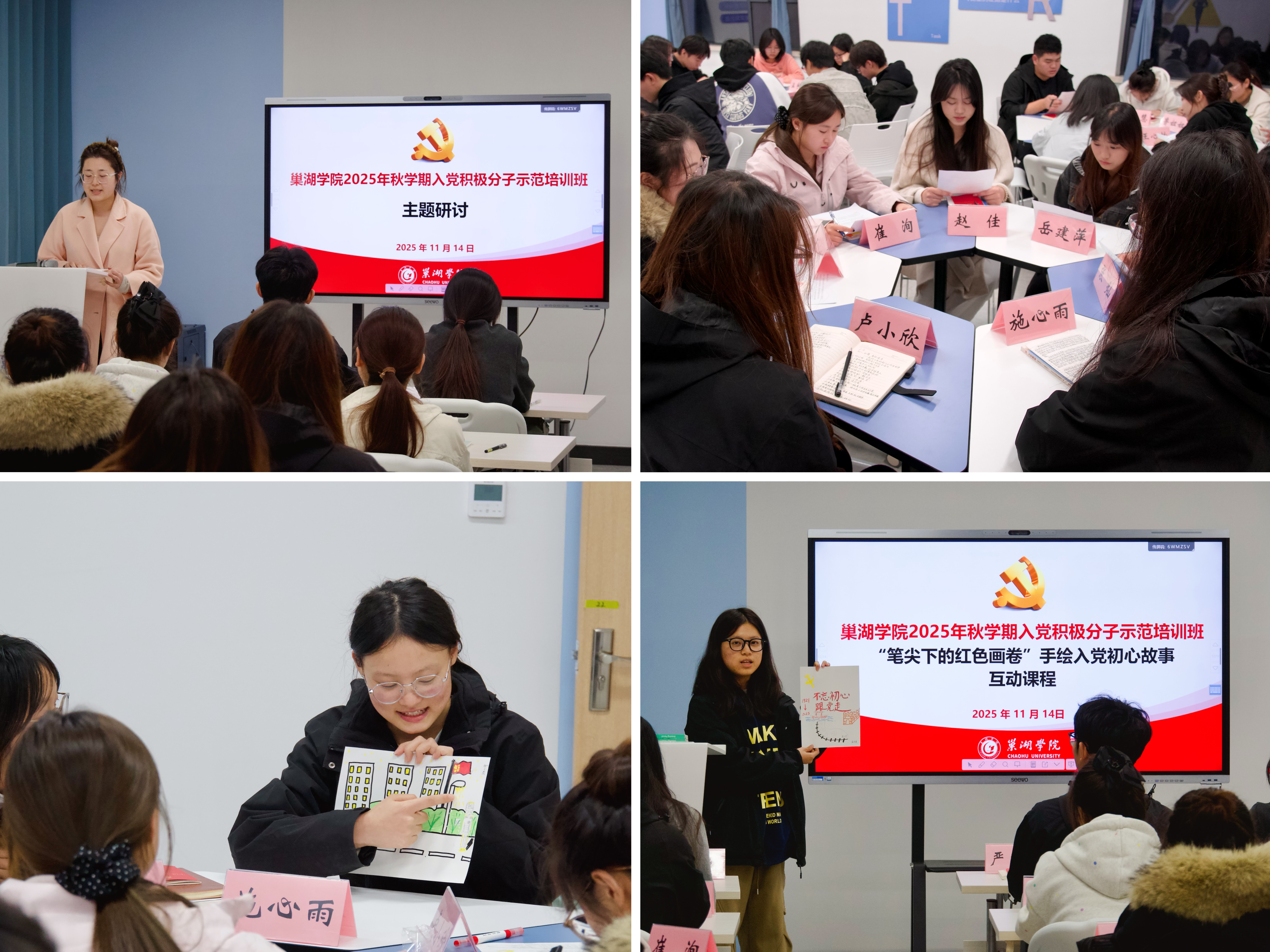 在主题研讨模块,学员们围绕“深入学习贯彻《习近平谈治国理政》第五卷”“入党积极分子如何在学风建设中发挥先锋模范作用”两大主题,结合专业实际与学习感悟深入交流;在互动课程中,学员们以画为言,诉说入党初心,一幅幅融合个人成长经历与红色血脉的作品,成为理想信念最生动的注脚。