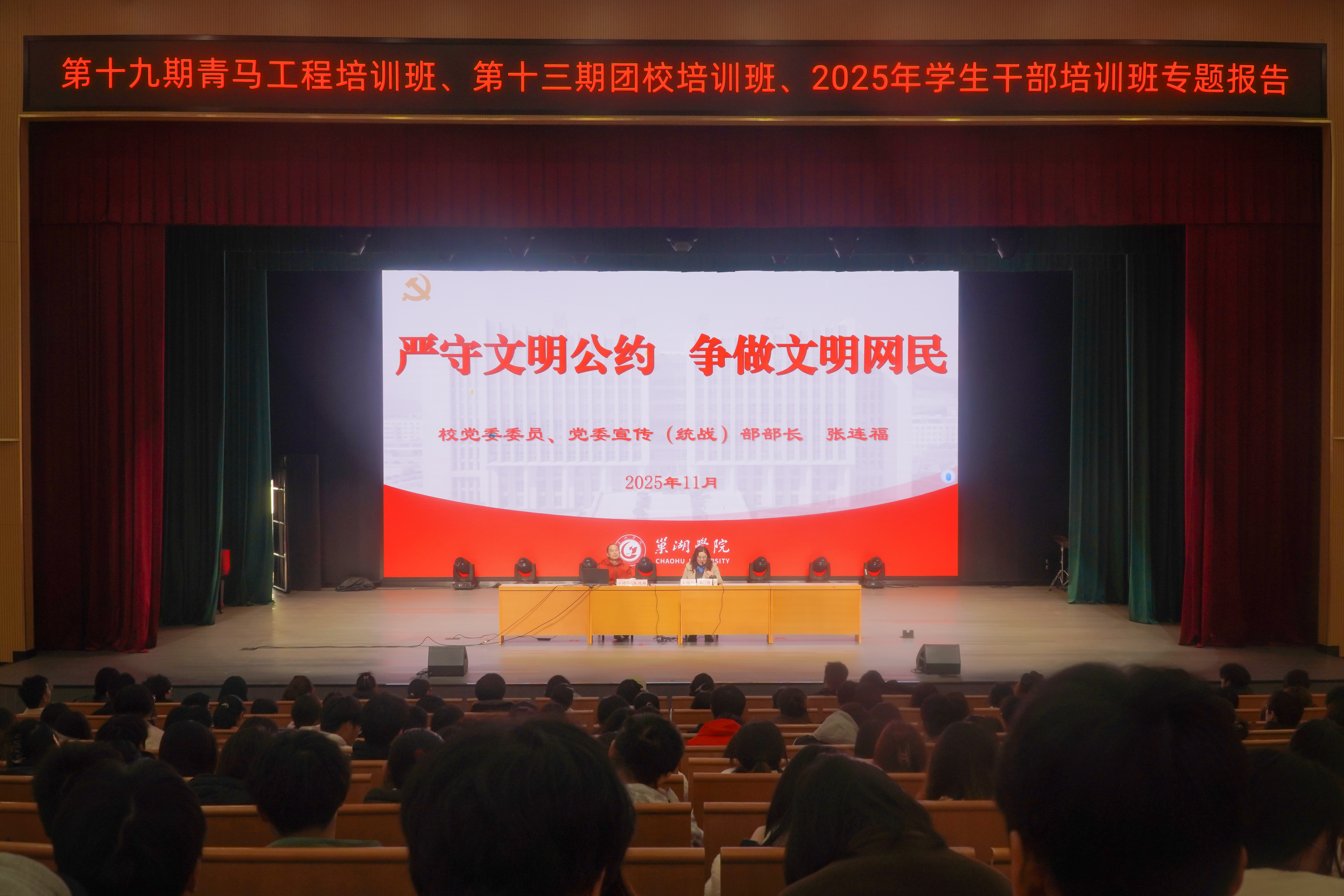 11月19日下午,校党委委员、党委宣传部(统战部)部长张连福在大礼堂为学校第十九期“青马工程”大学生骨干培训班、第十三期团校培训班、2025年学生干部培训班学员作题为《严守文明公约 争做文明网民》专题报告。报告会由校团委书记王倩主持。