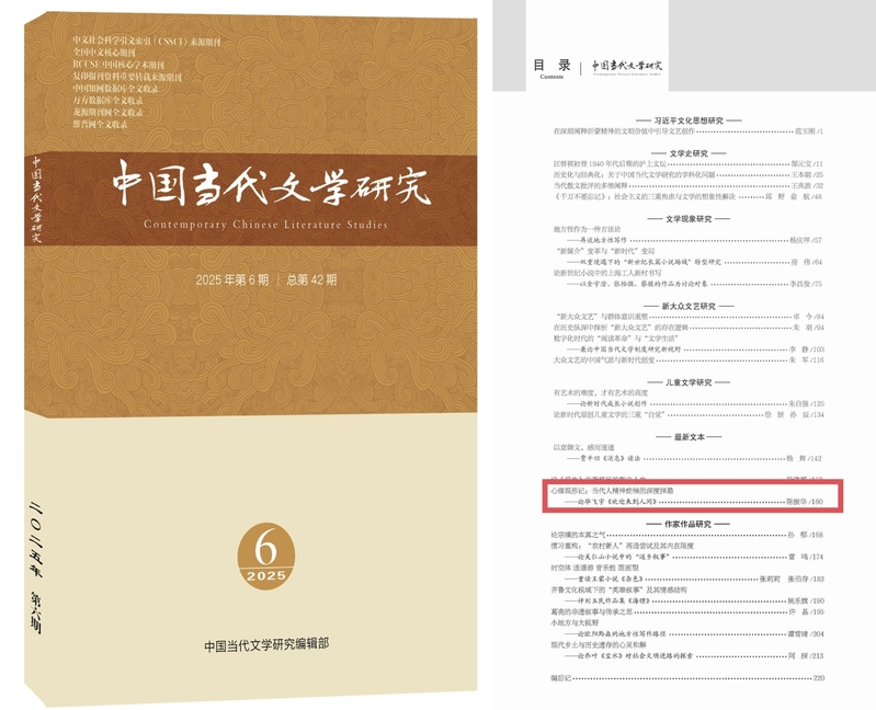 陈振华教授在《中国当代文学研究》2025年第6期发表题为《心理现形记:当代人精神症候的深度探勘——论毕飞宇<欢迎来到人间>》的研究论文。(文、图/康富强 初审/刘康凯 终审/彭正生 发布/康富强)