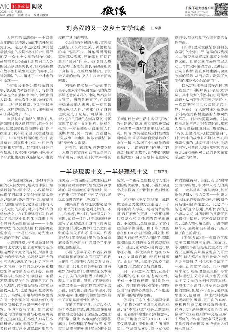 彭正生教授在《新安晚报》2025年11月12日第10版“徽派阅读”发表题为《一半是现实主义,一半是理想主义》的评论文章。(文、图/康富强 初审/刘康凯 终审/彭正生 发布/康富强)