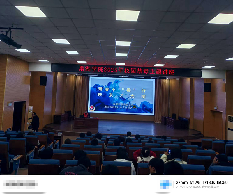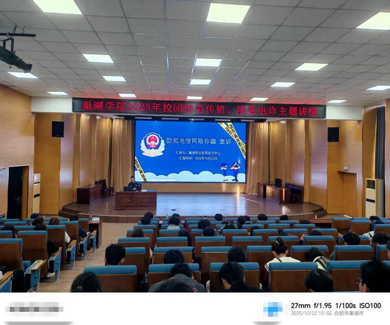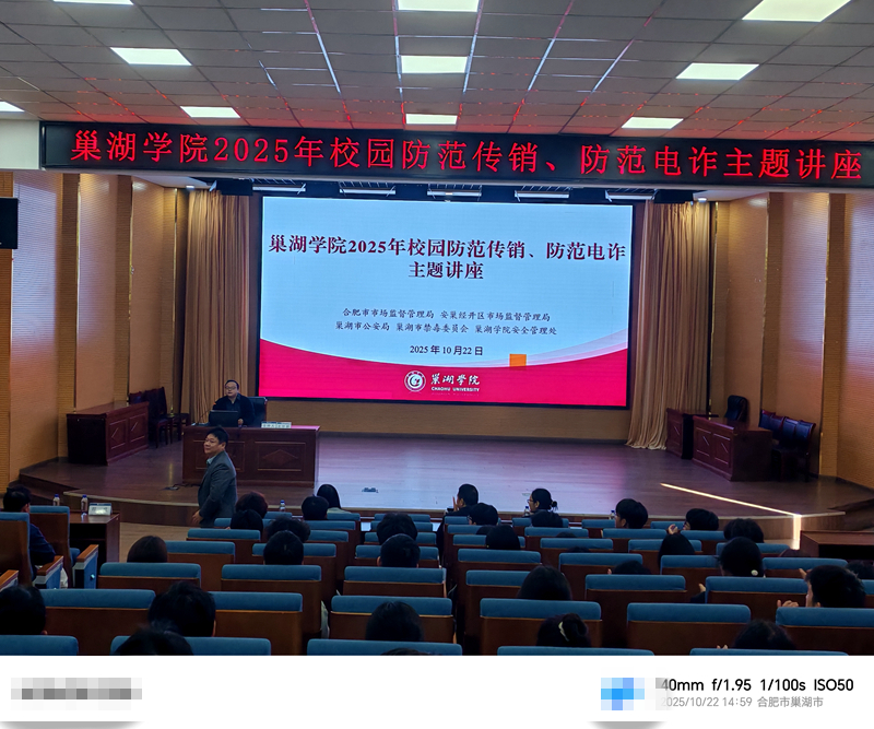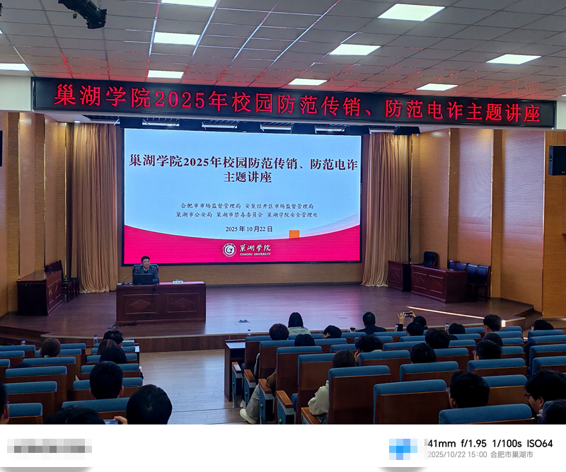 为切实增强大学生防范传销、电信诈骗和毒品侵害的意识和能力,营造安全、健康、和谐的校园环境,2025年10月22日下午,巢湖学院安全管理处分别邀请合肥市市场监督管理局、安巢经开区市场监督管理局、巢湖市公安局、巢湖市禁毒委员会在求实楼报告厅联合举办“校园防范传销、防范电诈与禁毒主题讲座”。本次活动由安管处副处长朱寒冰主持。