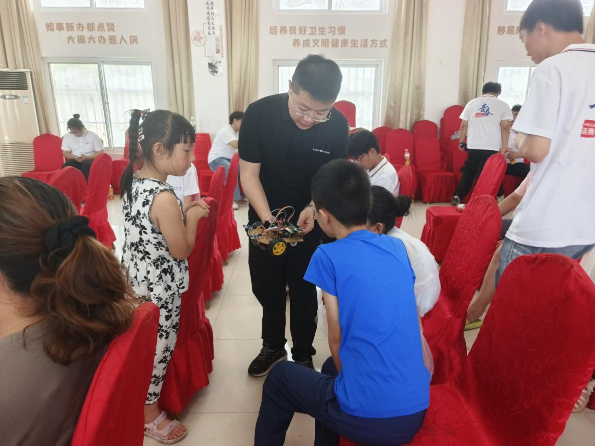 实践团队聚焦青少年科学素养提升,认真组织科学知识讲座、实物模型演示及互动问答等多样化科普活动。活动中,儿童群体积极参与,现场氛围热烈有序。青年志愿者坚持寓教于乐原则,运用通俗易懂的语言耐心讲解日常生活物理现象,通过典型案例剖析和形象化比喻,将抽象物理定律转化为具象化知识,有效激发儿童群体的科学探索热情。实践团成员精心准备智能车教学模型,通过实物展示与原理讲解相结合的方式细致演示智能车工作机制,并指导儿童现场实践操作,切实提升科学实践体验感与获得感。