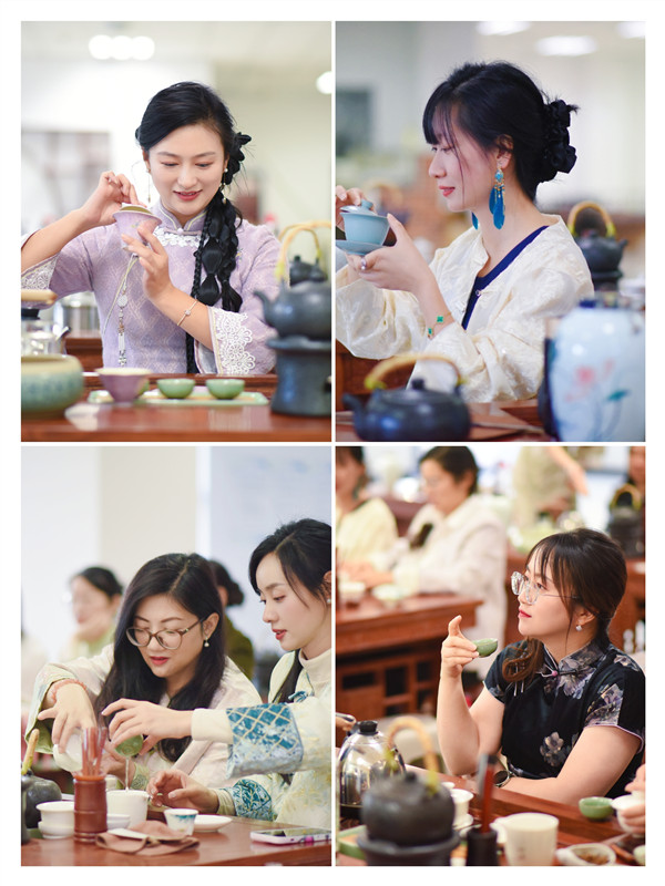 在互动体验环节中,在唐丽丽老师的指导下,女教职工体验了“备具、布具、冲泡、奉茶”的完整流程,从水温控制到注水方式,细致打磨每一个环节,在奉茶、品鉴的过程中,体悟“以茶会友、以礼相待”的东方待客之道。随后的 “旗袍秀”环节成为活动亮点,女教职工身着旗袍自信走秀、拍照,举手投足间将旗袍的柔美与茶文化的端庄完美融合。活动尾声,大家围坐品茗,交流体验心得,分享对茶文化与旗袍文化的理解。