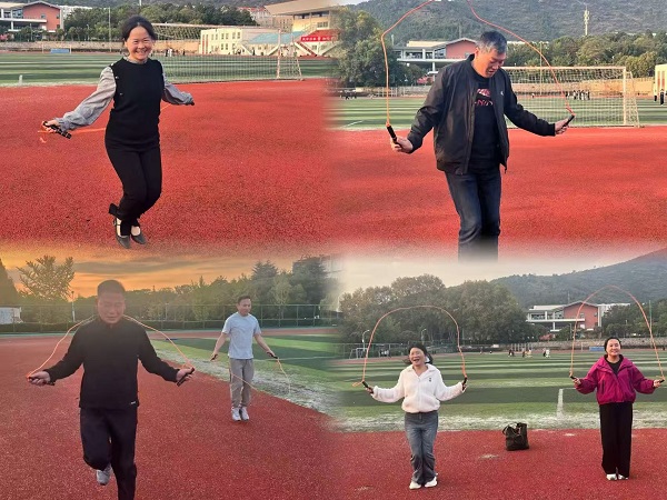 激情跃动燃秋意,教职工们身姿矫健,有的双手快速摇绳,脚尖轻盈点地,如飞燕穿梭;有的专注节奏把控,即使偶有失误仍坚持到底,现场加油声与欢笑声交织成一片。集体跳长绳项目将气氛推向高潮,各部门组成2-4人战队,轮番上场展示,摇绳队员奋力挥臂划出流畅弧线,跳绳队员鱼贯而入、步调一致,默契的配合引得观众阵阵喝彩。