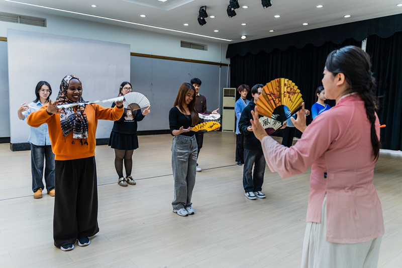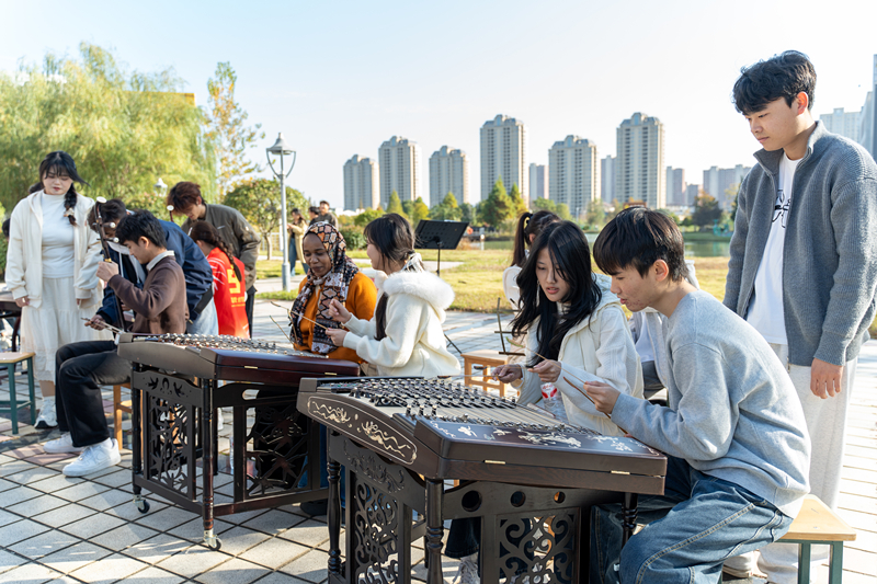 活动现场,多元艺术形式轮番登场,碰撞出别样火花。在中国古典舞体验环节中,教师教育学院舞蹈专任教师熊珊珊领衔示范指导,巢湖学院DS巢艺舞灵中国舞社团协助,中外学生共同欣赏并体验了《梁祝》舞段的柔美韵律,感受中国古典舞的意境之美。随后,民族器乐篇章更是将氛围推向高潮,在专业教师的指导下,由音乐表演专业学生共同演绎经典曲目《金蛇狂舞》,曲目运用了古筝、扬琴与二胡等器乐,琴弦轻拨间流淌着东方美学的空灵雅致,赢得阵阵掌声。演奏结束后,中国学生现场介绍乐器历史与发声原理,并邀请国际留学生们近距离观察、尝试弹奏,在互动中加深对中国传统音乐的理解。活动最后,音乐表演专业学生黄金涛现场演唱巢湖民歌《金桂花开》,进一步拉近了彼此的文化距离。