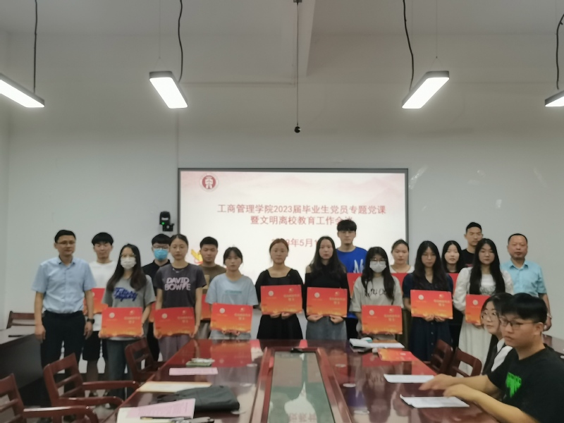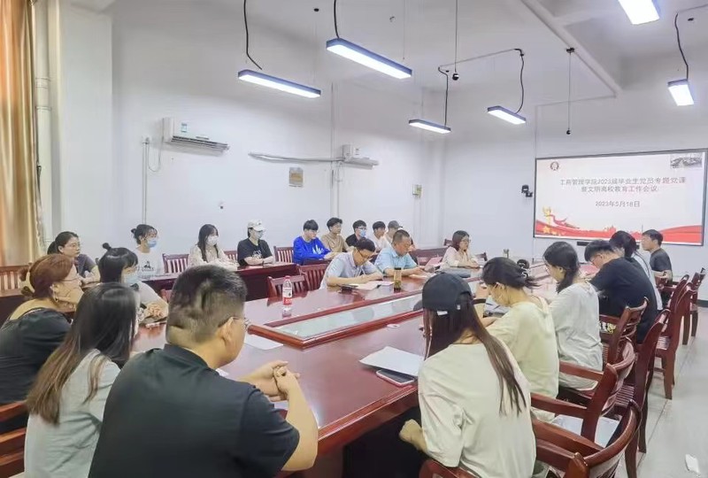 为深入开展学习贯彻习近平新时代中国特色社会主义思想主题教育,引导毕业生党员坚定信念、胸怀祖国,做勇立新时代潮头的奋斗者,5月18日工商管理学院在博学楼一楼会议室召开2023届毕业生党员专题党课暨文明离校教育工作会议。院党委书记管超,院党委副书记、院长陶有田,学生第六党支部书记葛晓龙和毕业生党员代表参加。会议由院副书记、纪委书记金晶主持。