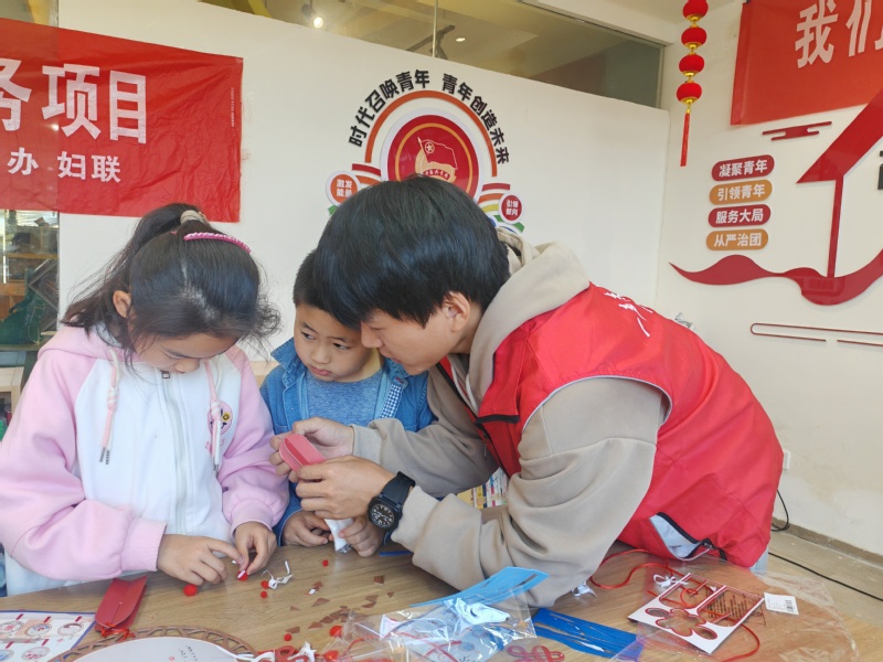 活动伊始,志愿者通过向小朋友们展示PPT,使小朋友们对二十四节气的变化过程有了初步的了解。随后,为培养小朋友们的文化素养,提升他们的思想品德,志愿者通过节气由来、二十四节气特点和传统习俗向小朋友们详细介绍中华民族传统节气文化。期间,志愿者组织小朋友们朗读二十四节气歌,进一步加深小朋友们对二十四节气的了解。最后,志愿者带领小朋友们一同开展二十四节气挂饰的手工活动,志愿者指导并帮助孩子们剪红绳、打结等,并对他们提出的问题耐心回答,进一步提高小朋友们的创造力和动手能力。