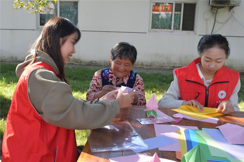 提着精心准备的慰问品,志愿者们来到敬老院,陪同老人们一起折纸,将卡纸折成寿桃和菊花的形状作为礼物赠送给他们,并祝福爷爷奶奶们寿比南山、吉祥如意。同时,志愿者组织多位老人进行象棋游戏,棋艺的比拼也是智慧的博弈,多位老人表示在下棋的过程中深切感受到来自志愿者的关爱与陪伴。活动过程中,志愿者与老人们进行亲切交谈。活动在温馨的氛围中进行,志愿者们的到来给敬老院带来了生机活力。