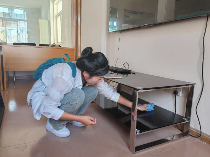 活动伊始,活动负责人张建忠组织志愿者于男寝四栋门口集合,清点到场人数并合理分配大家的工作。各志愿者积极参与,互相配合,热情地投入到清扫活动中去。志愿者秉承着不怕脏不怕累的精神,手持清扫工具,仔细地打扫服务站的各个角落。他们用抹布仔细擦拭桌子夹缝间的积灰;清扫地面的垃圾、灰尘,并拖地,将桌椅摆放整齐;将垃圾倒入垃圾桶内,并将清扫工具归于原处。张建忠在仔细检查后,将门窗落锁。经过他们的辛苦劳动,社区变得焕然一新。