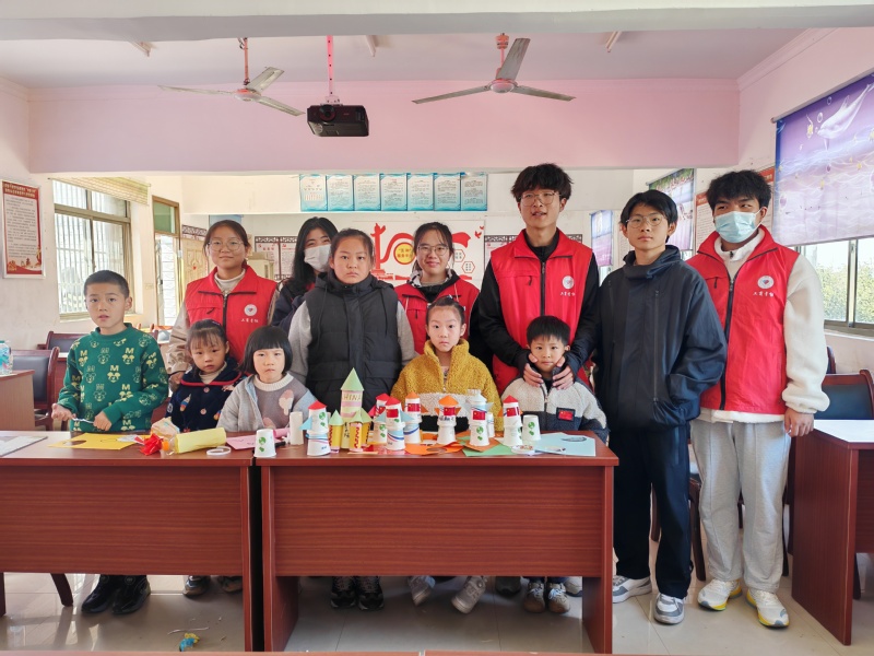 本次活动过程中,志愿者为孩子们播放视频,并为小朋友们介绍心理健康的重要性以及出现心理问题时可采取的解决途径。随后,志愿者通过放映PPT带领小朋友们了解我国在航空航天领域的卓越成就,激发小朋友们对科学的兴趣以及对太空的向往。接着,志愿者向小朋友们展示了手工制作火箭模型的视频,并为小朋友分发模型制作材料。小朋友在志愿者的帮助下使用牙签、纸杯、皮筋、卡纸等材料,最终制作出属于自己的火箭模型,并在作品上面写下了自己的名字。最后,孩子们拿着自己的火箭模型与志愿者进行合照,记录这珍贵的瞬间。每位志愿者也都将最美好的希望寄托于这些羽翼尚未丰满的雏鹰身上,或许在未来的某一天,制作火箭模型的孩子会成为一名勇于探索、致力于翱翔太空的科研工作者。