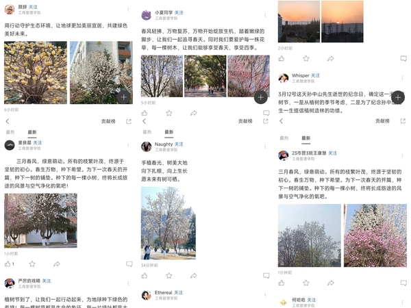 “妙笔生花”,万物盎然。同学们选择符合自己对爱树护树话题理解的语段,并择取原创花草四季摄影作品发布在今日校园“相约暖春,‘植’因有你”话题上。极富个人特色的话题讨论展示着每一位巢院学子对爱护校园生态环境的见解,包揽四季的摄影作品凸显着巢院每一个角落的勃勃生机。图片与文字交相辉映间,爱护校园环境、保护自然生态已深深烙印在全校师生的心底。