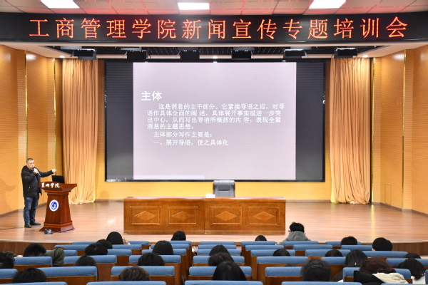 为提高同学们的新闻宣传能力,3月27日下午,工商管理学院在求实楼报告厅开展新闻宣传专题培训会。本次培训会邀请了新安晚报驻马鞍山市和巢湖市办事处主任、记者站站长金学永主讲,由工商管理学院党委副书记金晶主持,负责学院宣传工作专项教师李阳出席,主要从事宣传工作团学干部参加会议。