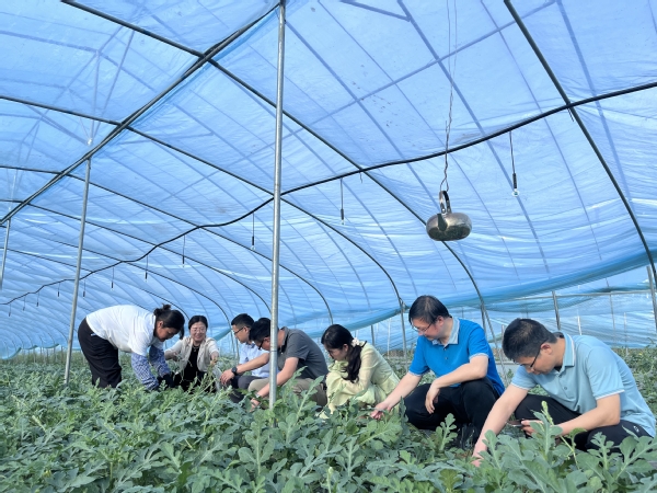 在大棚西瓜种植产业园中,工会成员们下到田间,帮助西瓜种植户开展压蔓整枝工作。种植户讲解了田间管理工作,工会成员们表示这场户外劳动教育生动实际,对汪桥村坚持的绿色经济发展理念表示由衷赞赏。