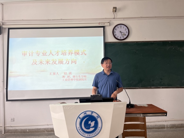 赵祺以《审计专业人才培养模式及未来发展方向》为题,为同学们带来一场别开生面的学业和就业指导课。他向全体同学详细解读了学院审计学专业的人才培养方案,包括培养目标、课程设置、学时安排等。为高质量完成学业和就业,赵祺向同学们提出三点建议:一是积极考证,如初级会计师资格证、初级审计师资格证、银行从业资格证、证券从业资格证等;二是要关注毕业资格审核要求,重视各类课程的学习,尤其是必修课和选修课学分要求;三是重视专业实践,围绕未来就业方向,积极参与学科竞赛和实习实训,提升职业技能。