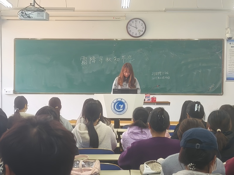 首先,韩晗向同学们详细介绍本次活动的主题及意义,引导同学们重视霜降和重阳节所蕴含的文化价值。接着,韩晗通过展示霜降时节大地银霜、草木凋零的景象,以及重阳节人们登高望远、插茱萸祈福的画面,让同学们直观地感受到传统节气与节日的独特魅力。随后,同学们在分享环节结合自身理解,分别从“古人对时节的感知”“重阳节敬老传统的当代意义” 等不同的角度发言,表达对传统文化的理解。最后,韩晗强调,传统节气与节日是中华文化的重要载体,蕴含古人智慧与情感,并呼吁同学们主动学习、传承传统文化。