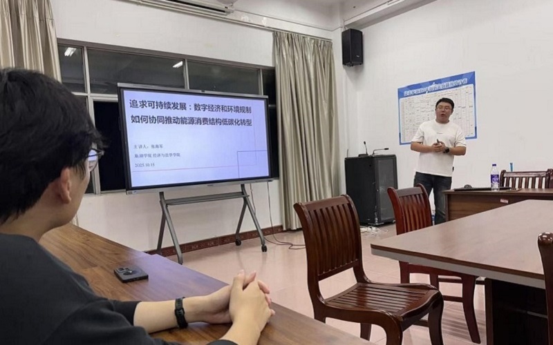 2025年10月15日,巢湖学院经济与法学学院开展题为“追求可持续发展:数字经济和环境规制如何协同推动中国能源消费结构转型”的讲座。本次讲座系学校汤山学术论坛的系列讲座之一,由经济学博士张海军主讲。