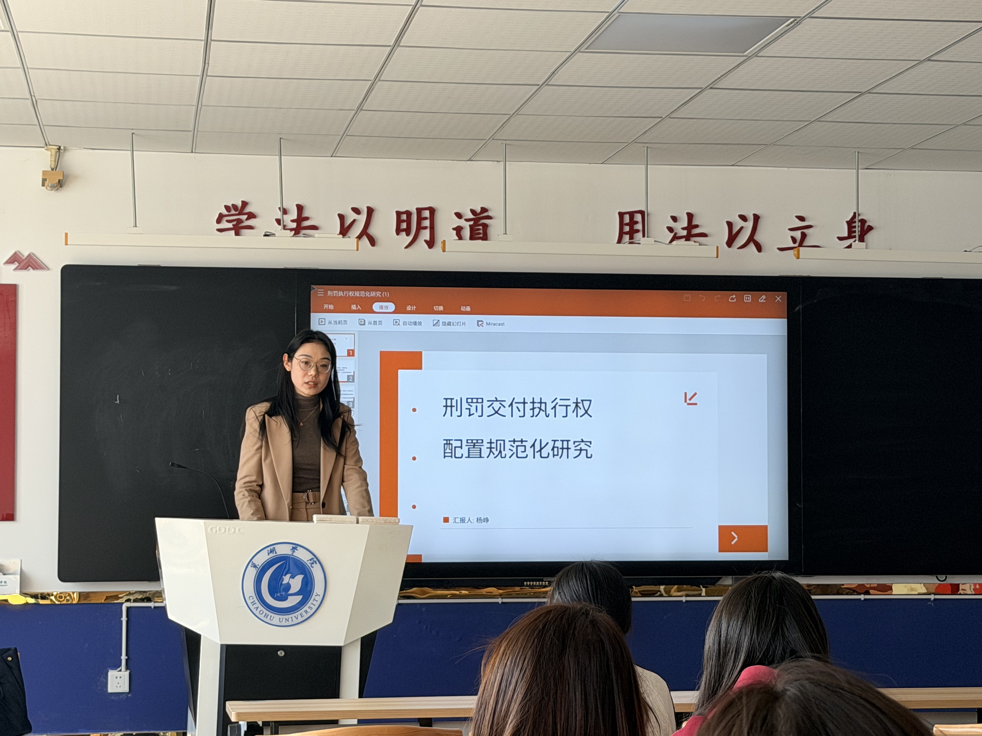 为持续提高教师科研能力和学术水平,2025年11月5日下午,经济与法学学院在博学楼302(法治教室)举办第三期求实博士讲坛,本期主讲人是法学系杨峥博士,主题为“刑罚交付执行权配置规范化研究”。讲坛由经济与法学学院法学系主任褚业娴副教授主持,法学系师生参加。