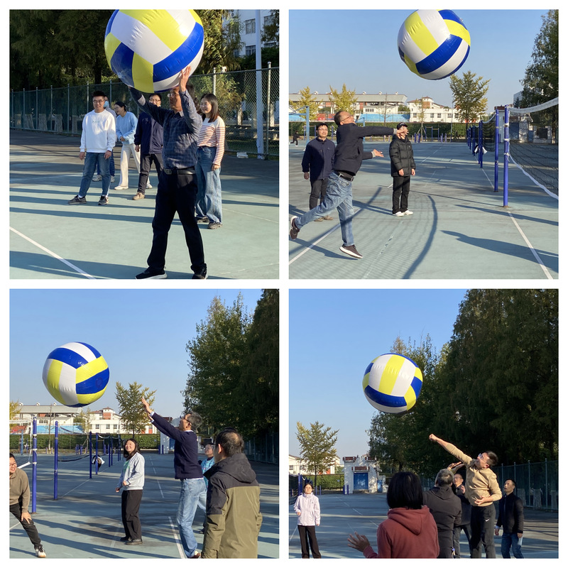 比赛伊始,那颗特制的“超大号排球”一登场就成了全场焦点。与传统排球赛不同,本次比赛特别选用超大号排球,它体积庞大,飞行速度慢,轨迹飘忽不定,让接球充满了意外和乐趣。同时,适当降低网高、放宽持球尺度,大大提升了比赛的趣味性和参与度。比赛以系为单位组队,行政人员也单独成队,共计四支队伍参与角逐。