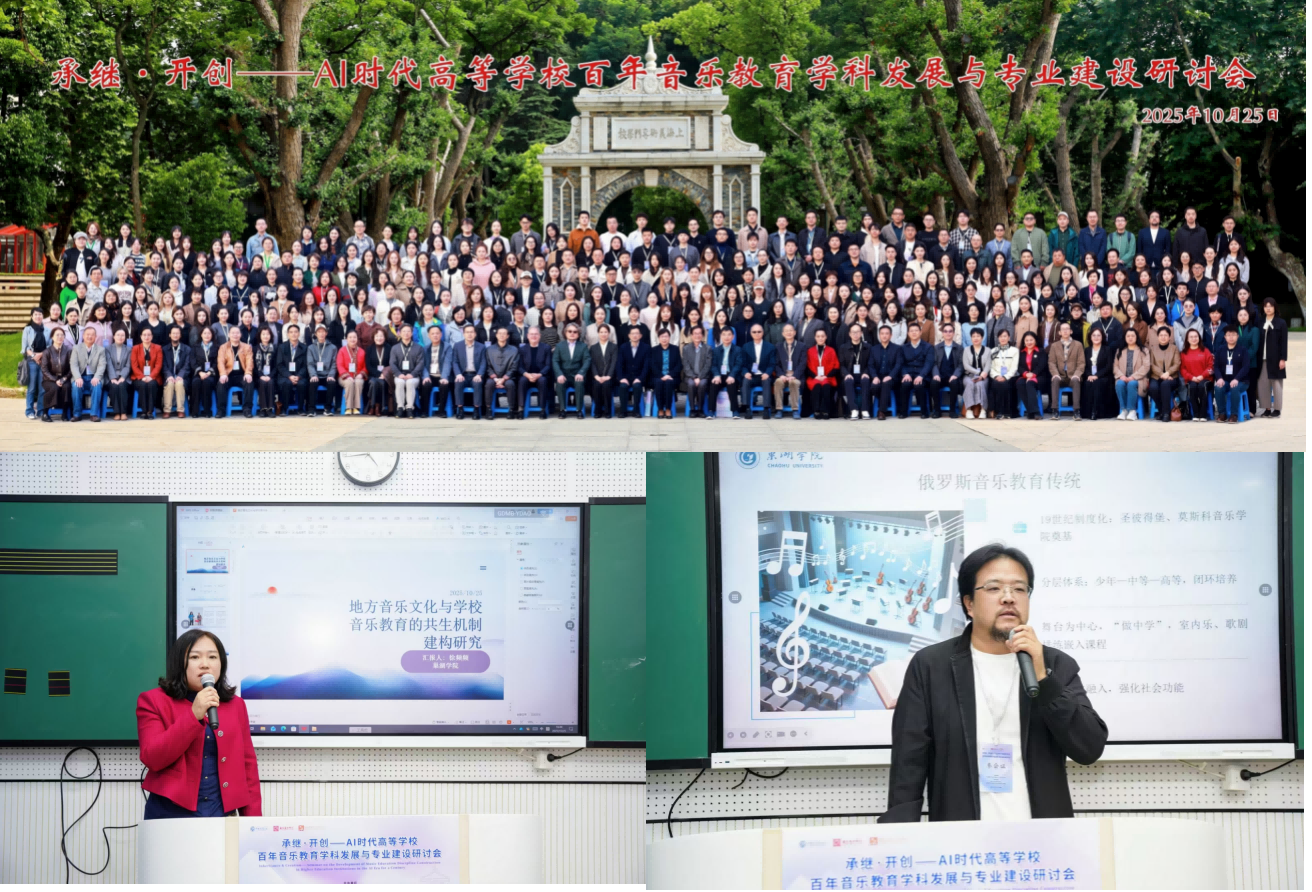 10月25日至26日,由中国教育学会音乐教育分会、南京艺术学院联合主办的“承继·开创——AI时代高等学校百年音乐教育学科发展与专业建设研讨会”在南京艺术学院召开。来自全国专业音乐学院、综合艺术学院及综合性高校音乐专业的近300位专家、青年学者齐聚一堂,围绕中国音乐教育百年历程、“AI +音乐教育”、教学改革等七大核心议题展开深度研讨。教师教育学院教师崔雁涛、徐频频、王程、戴铭四位教师受邀参会。