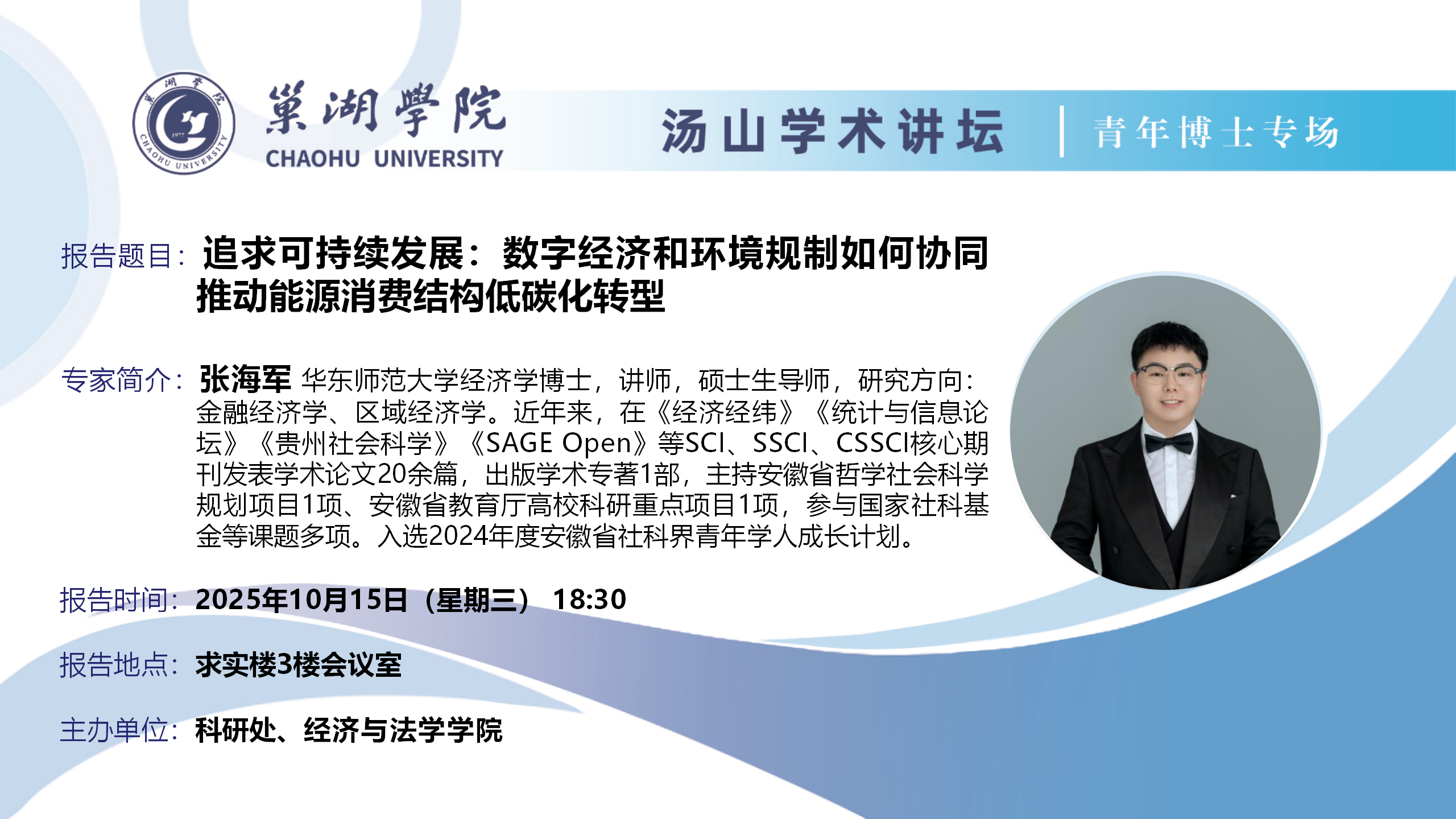 汤山学术讲坛青年博士专场第21讲:(10月15日:经济与法学学院张海军博士讲座)