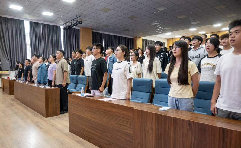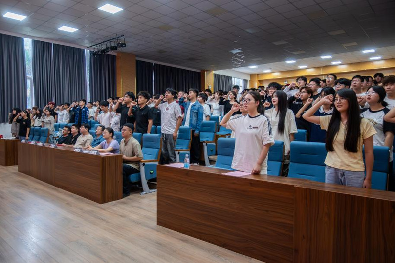 随后,全体2025级新同学庄严宣誓:“坚守求学初心,勤勉笃行筑牢学业根基;勇攀学术高峰,立志考研追求卓越发展;恪守校规校纪,修身立德团结同窗师长;胸怀家国天下,锤炼本领担当时代重任!”誓言铿锵,展现了新生们不负青春、砥砺前行的坚定信念。