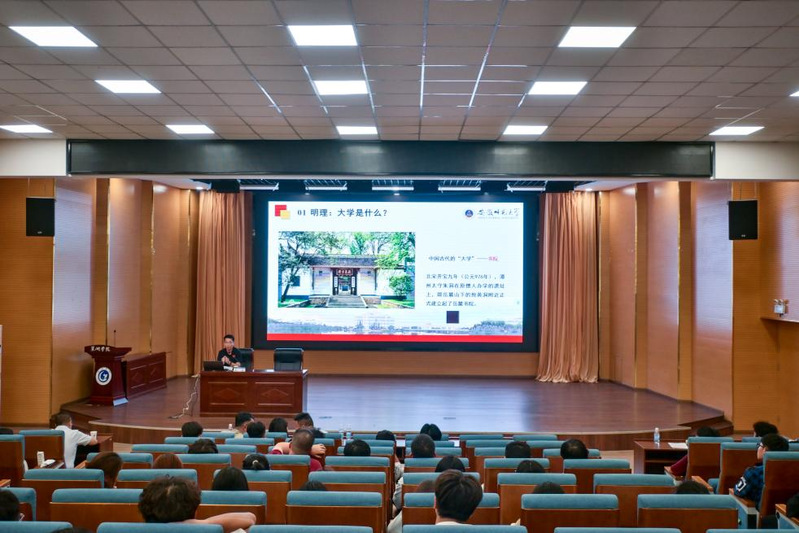 典礼结束后,学院邀请安徽师范大学校团委书记陈骁博士开展了《奋斗,做最优秀的自己》为主题的报告会。陈骁围绕专业认知、校纪校规、生涯规划、安全教育等内容开展专题讲解,助力新生顺利开启大学生活,科学规划学业发展。