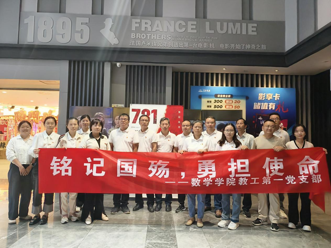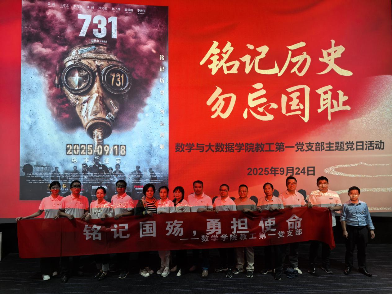 为扎实推进新时代高校党建示范创建和质量创优工作,加强理想信念教育,提升党员党性修养,9月24日下午,数学与大数据学院教工第一党支部开展“铭记历史·勿忘国耻”主题党日活动,集中观看历史题材电影《731》。