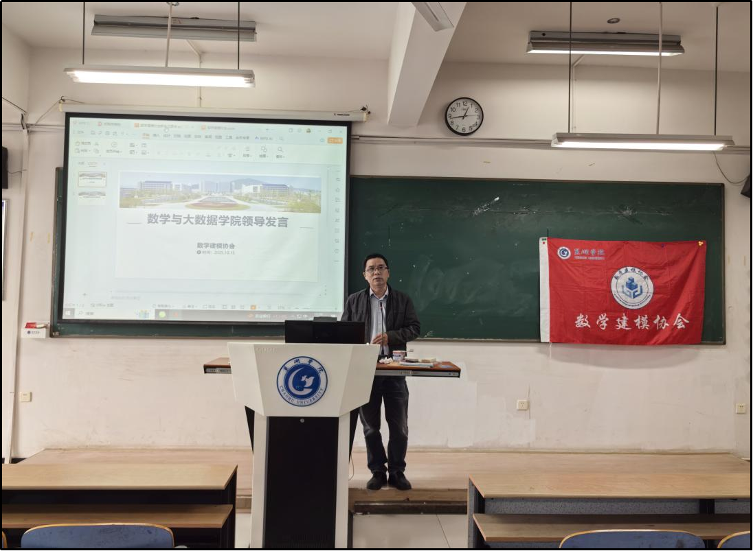 陈小波从数学建模的本质出发,指出其作为连接理论与现实的重要桥梁,在培养学生探索精神与解决实际问题能力中的关键作用。他向同学们提出三点期望:一要锤炼科学思维,提升逻辑分析与理性判断能力,以此应对学习与未来挑战,形成个人核心竞争力;二要注重团队协作,在团队中实现思想交流与能力互补,学会沟通、尊重与合作,促进个人与团队共进;三要坚守学术初心,弘扬科学精神,在建模学习与竞赛中保持理性思辨,恪守学术道德,共同营造清正严谨的学习氛围。他同时表示,学院将持续支持协会发展,并祝愿全体新成员在建模之路上学有所成、行有所获。