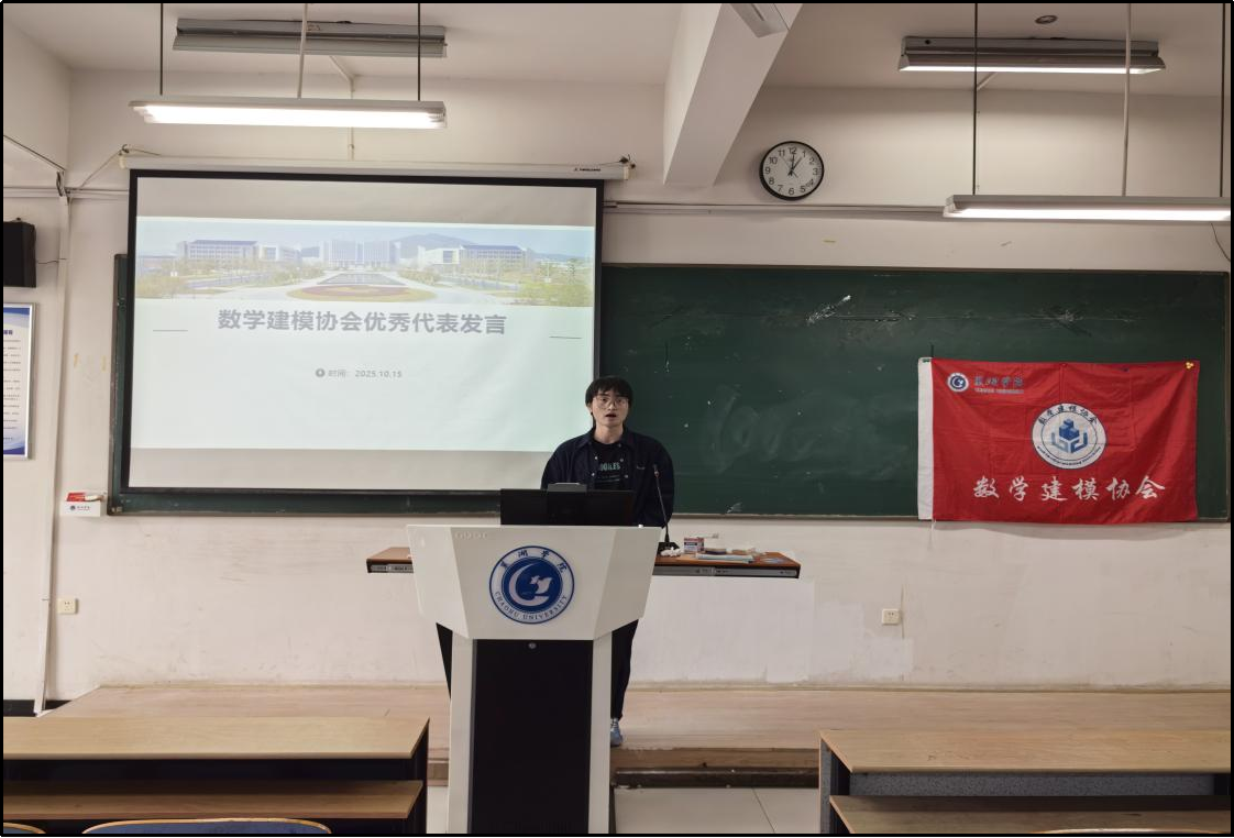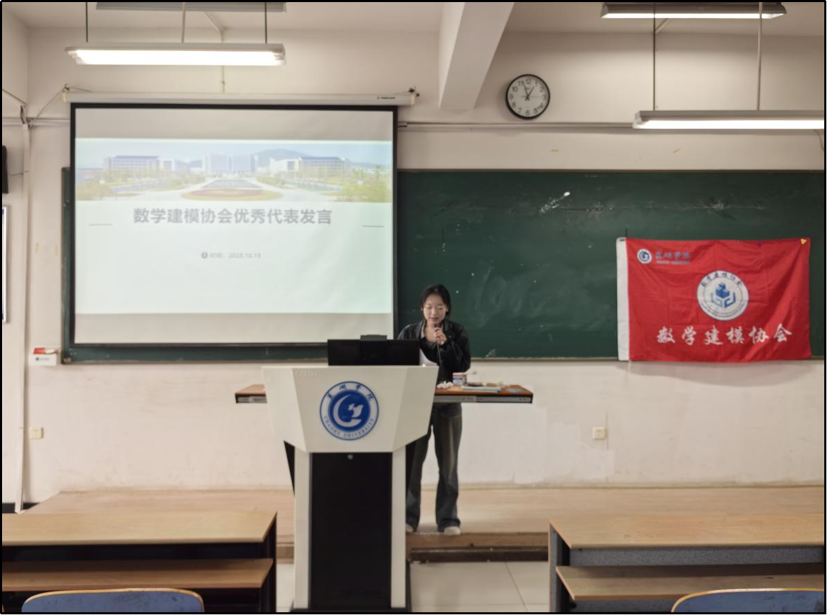 在经验分享环节,2023级优秀会员代表陈婧结合自身参赛经历,鼓励新生勇于尝试、不畏困难。她表示,“每一次竞赛参与都是成长的机会,不必因初学而生畏,协会的师长与同伴将是你们前行路上坚实的支持。”同为优秀代表的孙可豪则围绕“以赛促学、以学促创”的主题,分享了他在建模竞赛中的探索历程与解题心得,激励新生尽早投入学科竞赛,敢于突破思维定式,在团队协作与创新实践中挖掘潜力、点亮大学生活。