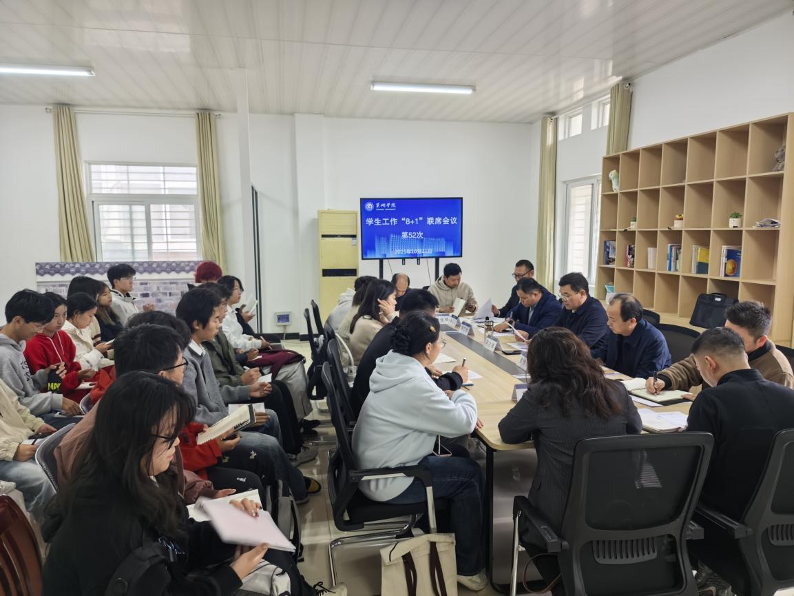 10月21日下午,巢湖学院第52次学生工作“8+1”联席会议在泮山苑·青春领航一站式学生社区顺利召开。校党委副书记宋立敏主持会议,宣传部、学工部、保卫部、教务处、后勤处、信息化处、图书馆、团委等部门主要负责人及2025级学生代表共同参会。