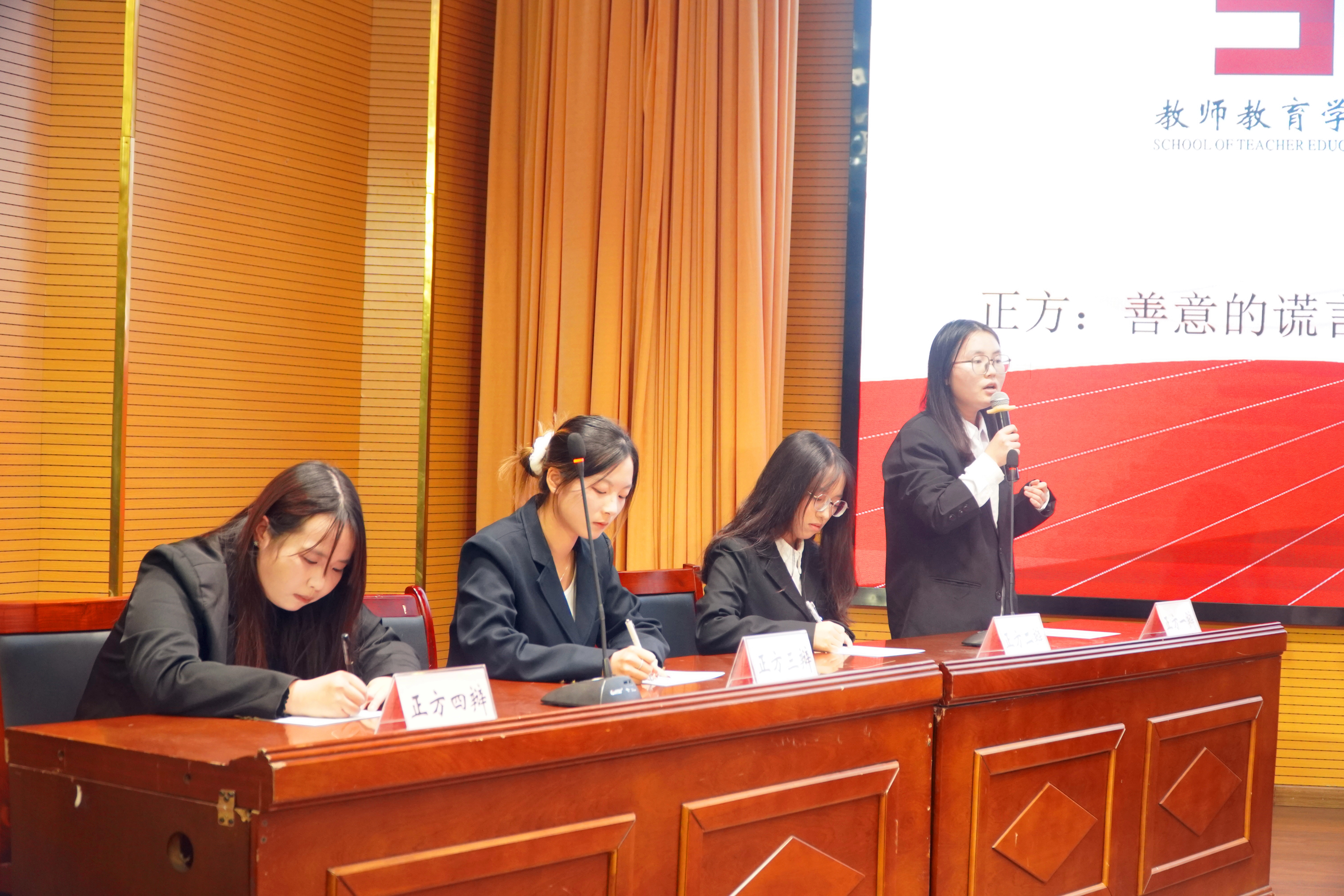 决赛现场气氛热烈,两场巅峰对决精彩迭起。首场辩论聚焦“过程和结果哪个更能体现青年人奋斗的价值”,正方文学与传媒学院代表队立足过程中的成长积淀,主张“过程更能彰显奋斗价值”;反方工商管理学院代表队则以结果的导向性为核心,强调“结果是奋斗价值的核心体现”。双方辩手旁征博引,巧妙融合历史典故、名人名言与哲学、社会学等多领域知识,在自由答辩环节针锋相对、紧抓核心争议点,犀利的提问与精准的回应多次将比赛推向高潮。第二场辩论围绕“善良的谎言是利大于弊还是弊大于利”展开,正方教师教育学院代表队从情感关怀、现实需求出发,论证善意谎言的积极意义;反方飞鸿演讲与朗诵协会代表队则聚焦诚信本质,剖析善意谎言背后的潜在风险。辩手们你来我往、妙语连珠,严谨的逻辑架构、敏捷的应变思维与铿锵有力的表达,深深折服了在场观众,现场掌声与喝彩声此起彼伏,充分展现了青年学子的思辨魅力与青春风采。