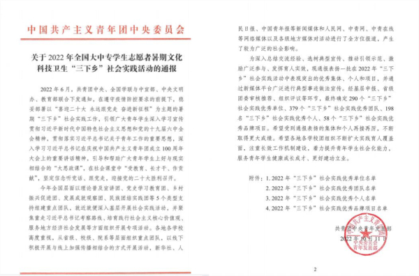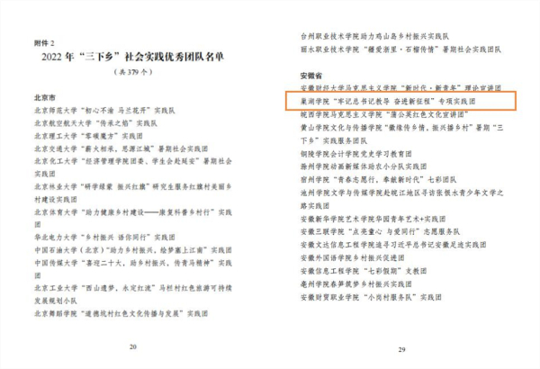 近日,共青团中央青年发展部对2022年全国大中专学生志愿者暑期“三下乡”社会实践活动表现突出的优秀单位、团队和个人予以通报表扬,遴选出379支“三下乡”社会实践优秀团队。我校“牢记总书记教导 奋进新征程”专项实践团获评全国“优秀团队”,安徽省共有15支团队获得表彰。
