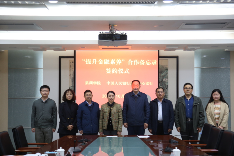 为加强社会实践平台建设,巩固毕业生就业实习渠道,提升高校学生金融素养,深入推进银校合作,10月27日下午,校党委委员、副院长朱定秀,经济与法学学院院长徐志仓、党委副书记解雪梅等一行赴中国人民银行巢湖中心支行签署合作备忘录。中国人民银行巢湖中心支行党委副书记、副行长朱波,党委委员、副行长凌代才、办公室主任王祥君出席了签约仪式。