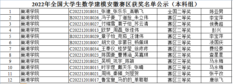 近日,2022年“高教社”杯全国大学生数学建模竞赛成绩正式公布。巢湖学院学子获得全国二等奖1项,安徽省二等奖3项,安徽省三等奖8项,在安徽省应用型高校中获奖率排名前列。
