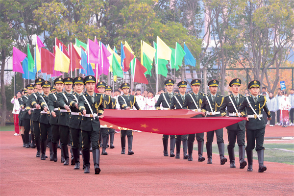 上午8时,运动会开幕式拉开帷幕。校旗和会旗方队踏着整齐的步伐,昂首阔步走向主席台,在师生的注视中率先出场。