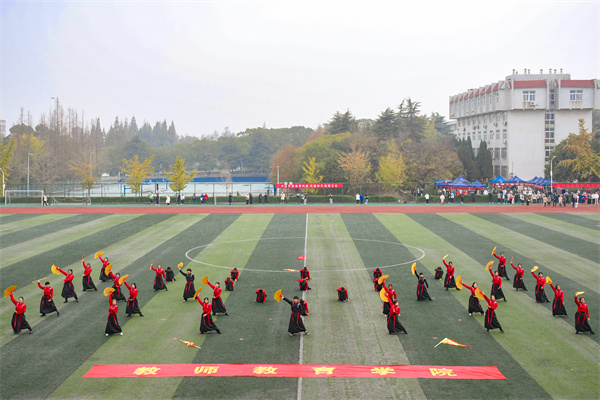 开幕式上,各具特色的文艺汇演依次登场展示,令人目不暇接。工商管理学院、汤山鼓韵打击乐团带来的鼓队表演,清亮的鼓点、激昂的旋律响彻田径场,恢弘的气势和铿锵的节奏,奏出了巢院学子昂扬向上的精神风貌。教师教育学院带来的舞蹈《霍元甲》快慢相间、动静结合,别出心裁的演绎方式,使在场师生们眼前一亮。旅游管理学院的礼仪操表演,用形体语言诉说礼仪规范,用艺术形式展现文明内涵,带来了一场精彩纷呈的视觉盛宴。文学与传媒学院带来的舞蹈《红心向党》,舞者在节奏鲜明的乐曲伴奏下,翩翩起舞,展现了新时代我校师生爱党爱国、积极向上的精神风貌。体育学院带来的花球啦啦操表演和舞蹈《千年之约》,充分展现巢院学子奋发有为的青春活力,表演的同学们随着节拍舞动,散发出青春的活力,舞动出生命的精彩。