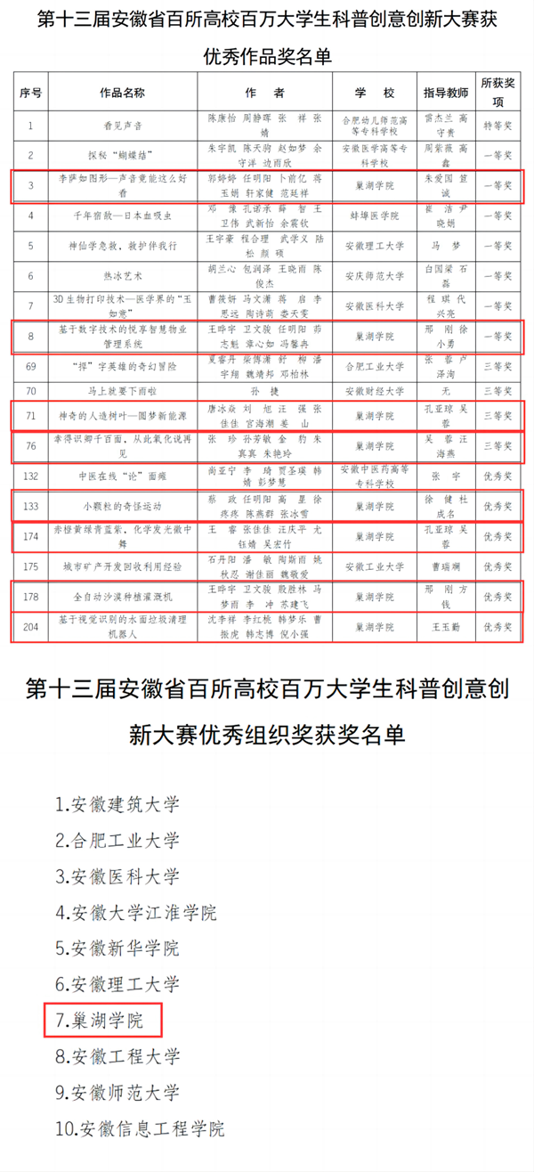 近日,由省科协、省教育厅、团省委共同主办的第十三届安徽省百所高校百万大学生科普创意创新大赛决赛获奖结果揭晓。我校报送作品获一等奖2项,三等奖2项,优秀奖4项,学校荣获优秀组织奖。这是我校继大赛第九届获一等奖1项后再次斩获一等奖,为历年最佳赛绩。