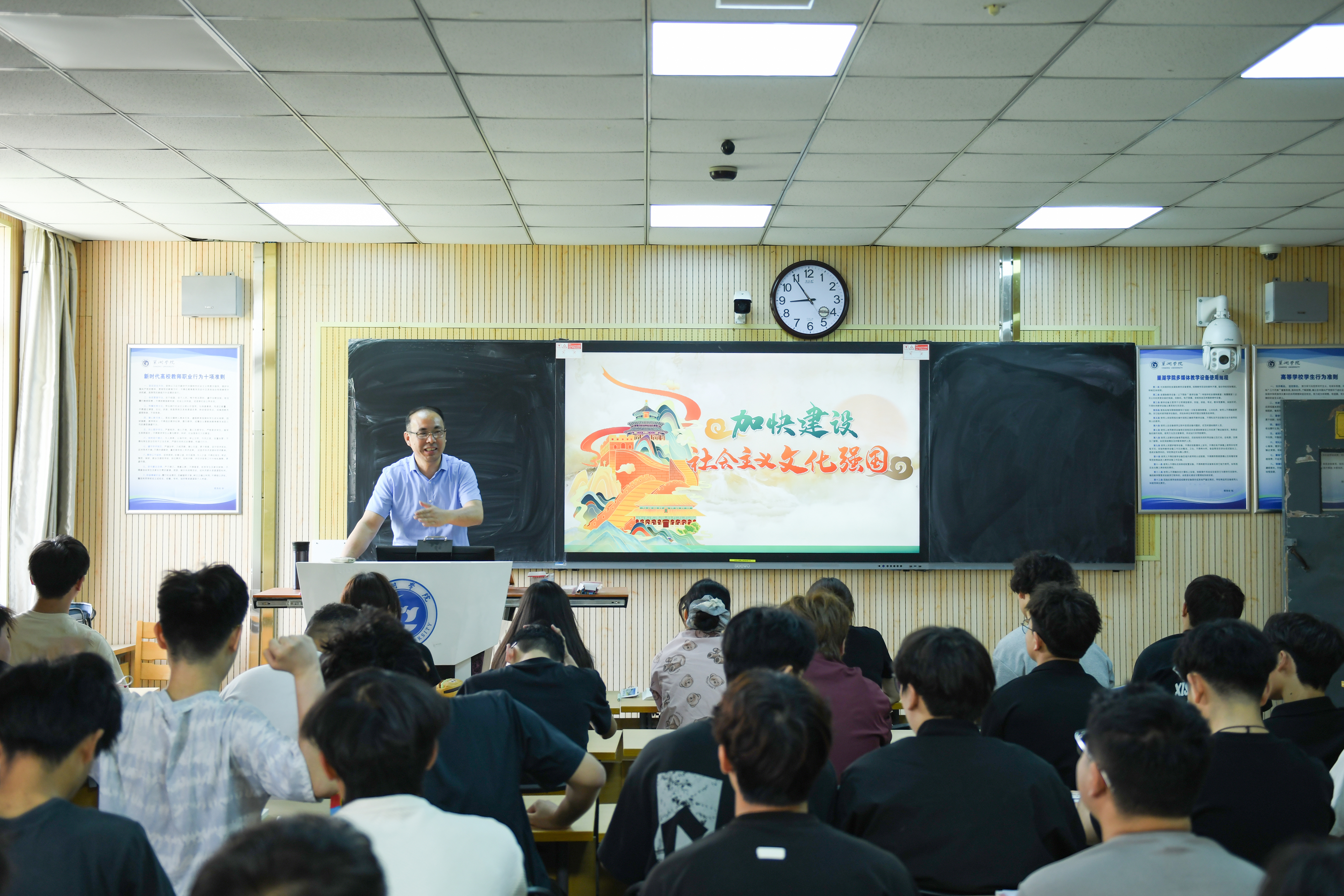 5月7日,校党委委员、副校长丁俊苗为机械工程学院2023级机械电子工程班学生讲授形势与政策课。丁俊苗结合个人研究成果和学生专业实际,从中西文化之争和古今文化之争的历史演变视角,详细阐释了社会主义文化强国建设的整体背景,并从“为什么”“怎么建”和“未来怎么做”三方面系统分析了加快文化强国建设的重大意义、成就和未来落实举措。他的授课引经据典,重点突出,融学术性、思想性和教育性于一体。他强调,当代大学生既是中华优秀传统文化的继承者,更是社会主义文化强国建设的生力军,要将个人成长与文化强国建设同频共振,要积极学习领会习近平文化思想和社会主义文化强国的相关论述,要切实处理好学习过程中的专和博之间的关系,开阔胸襟,志存高远,坚定“四个自信”,为建设社会主义文化强国贡献青春力量。