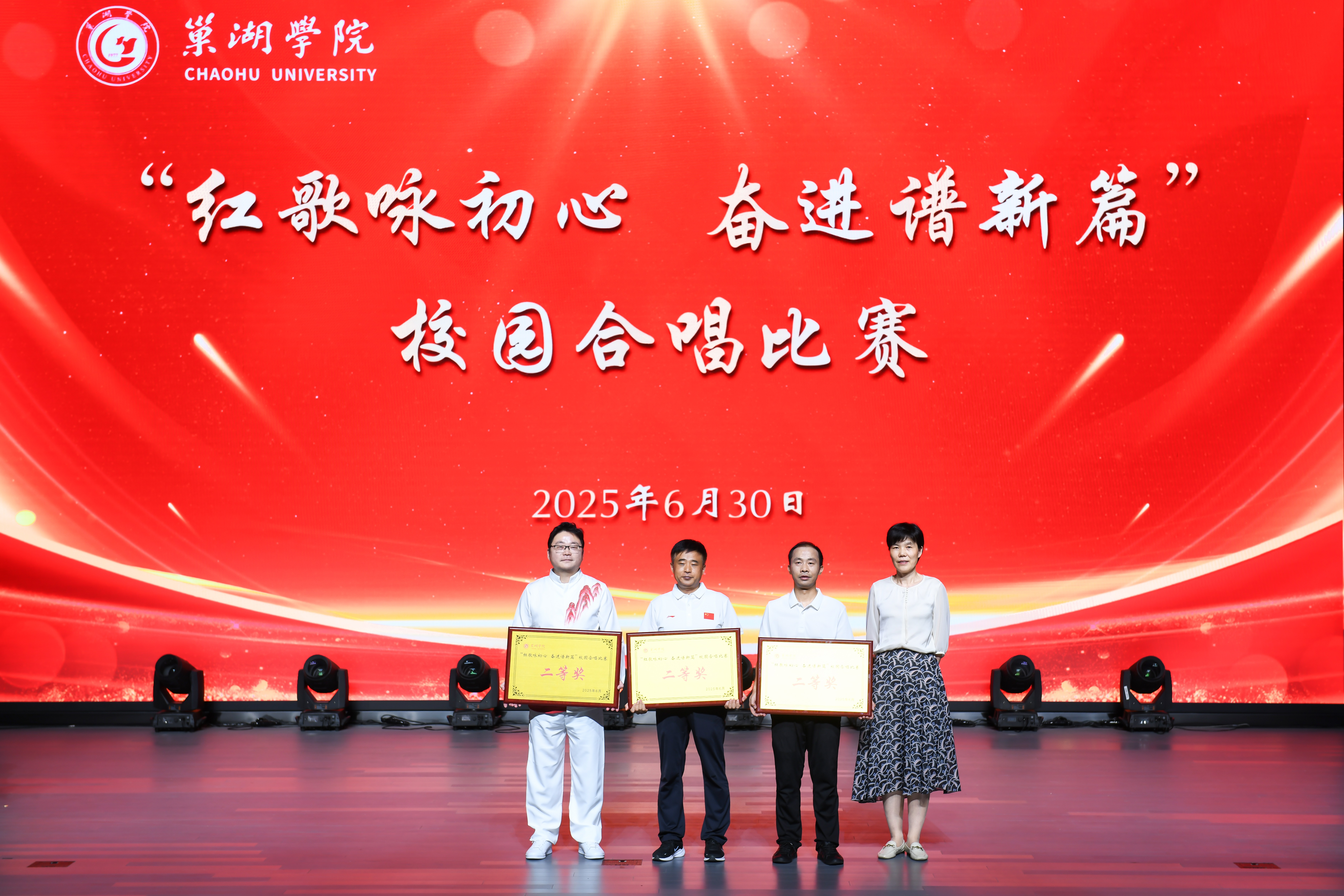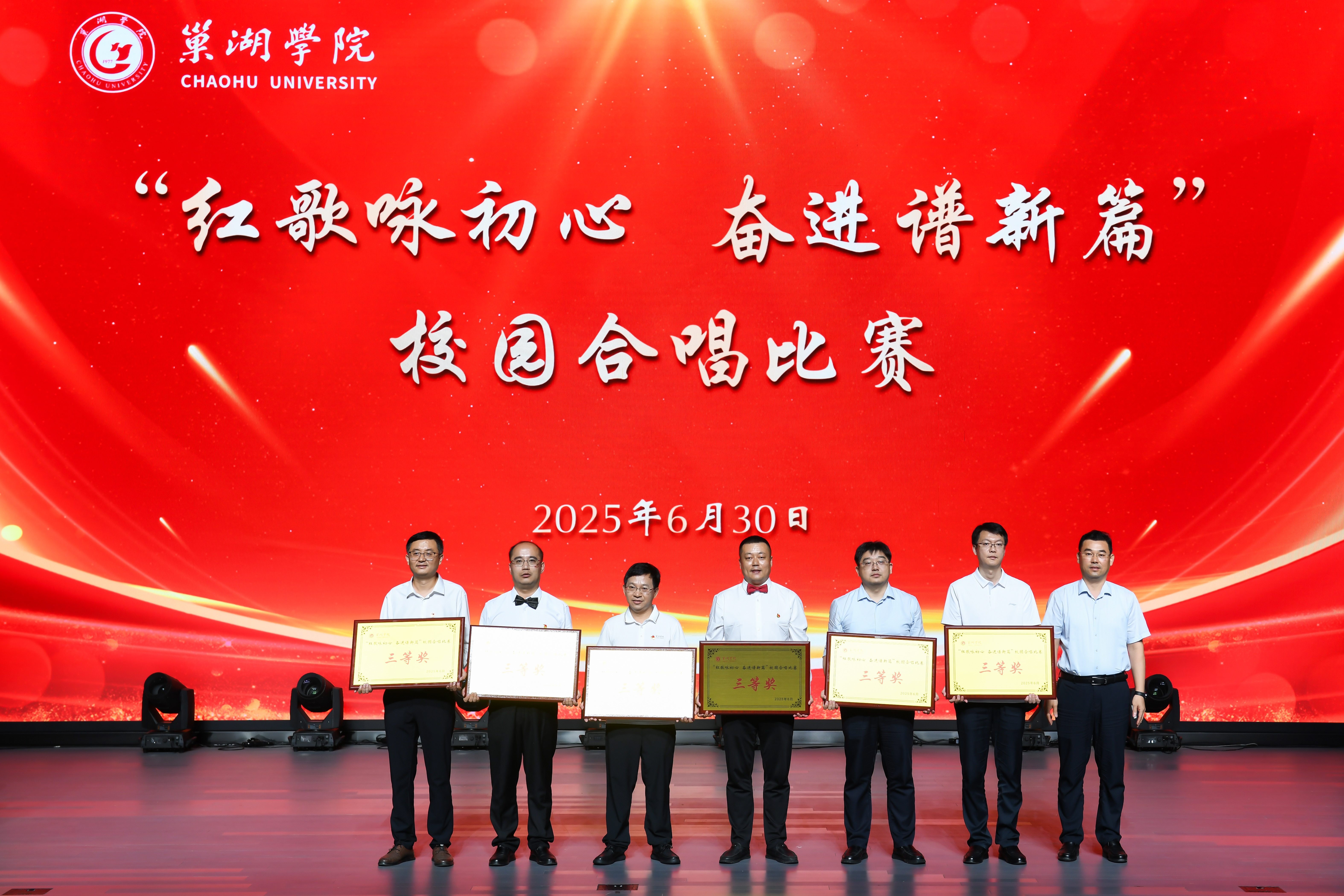 为庆祝中国共产党成立104周年和纪念中国人民抗日战争暨世界反法西斯战争胜利80周年,传承红色基因,凝聚“申硕”攻坚奋进力量,6月30日下午,巢湖学院在大学生活动中心大礼堂成功举办“红歌咏初心 奋进谱新篇”校园合唱比赛。