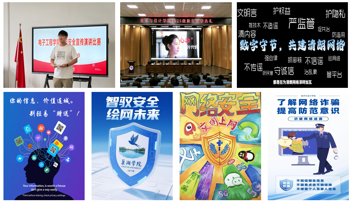 学校各单位立足自身优势,打造特色化网络安全宣传教育活动,推动网络安全知识入脑入心。化学与材料工程学院举办“网安你我他”短视频拍摄大赛,以镜头传递安全理念;外国语学院、计算机与人工智能学院、经济与法学学院开展网络安全原创海报征集,用设计诠释网络安全防护意识;文学与传媒学院充分发挥广告学、网络与新媒体等专业优势,组织学生创作原创海报、微视频、表情包等作品,比如2023级网络与新媒体专业微视频《指尖上的守节》,以日常场景倡导网络安全守护;美术与设计学院组织新生集体观看“反诈”宣传片,并在开学典礼中增设网络安全专题,通过案例剖析增强新生防范意识。电子工程学院举办网络安全主题演讲比赛,既为学生提供展示平台,更让网络安全知识深度传播。体育学院通过学院微信公众号推送网络安全知识,倡导依法文明上网。