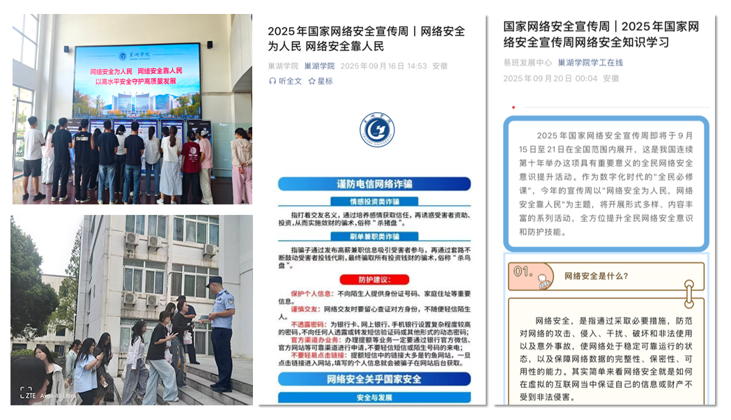 2025年国家网络安全宣传周于9月15日至21日在全国范围内举办。巢湖学院积极响应号召,紧扣“网络安全为人民,网络安全靠人民——以高水平安全守护高质量发展”主题,开展形式多样、内容丰富的宣传教育活动,全力普及网络安全知识,提升师生网络安全素养,致力于营造清朗的校园网络空间。