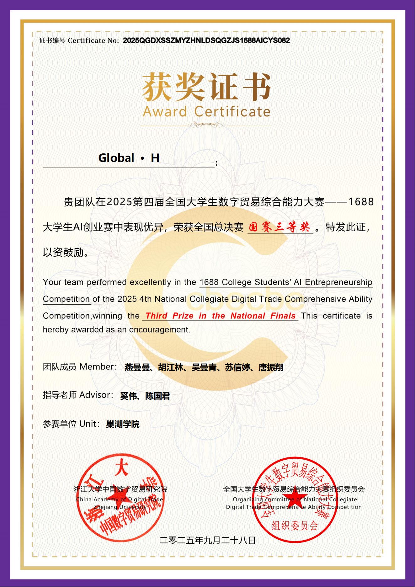 9月26日-9月28日,第四届全国大学生数字贸易综合技能大赛在浙江大学举行。巢湖学院外国语学院商务英语专业参赛队伍GlobalHorizon继荣获省赛一等奖后被遴选晋级该项赛事,代表学校与全国百余支队伍同台竞技。