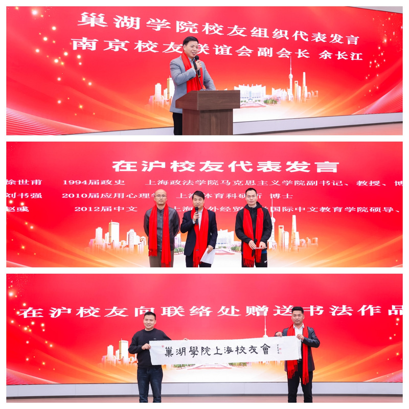 巢湖学院南京校友联谊会副会长余长江作为校友组织代表发言,对巢湖学院上海校友联络处的成立表示祝贺。在沪校友代表徐世甫、刘书强、赵彧分别发言,分享了在沪工作生活的感悟,表达了对联络处成立的美好祝愿。仪式上,2009届校友李长富代表在沪校友向联络处赠送了中国书法家协会会员丁惠增创作的书法作品,以笔墨承载情谊,象征巢院精神的绵延与传承。