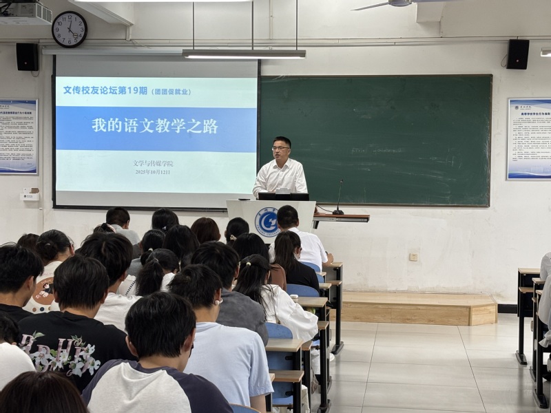 10月12日上午,文学与传媒学院在慎思楼北102举办第19期校友论坛。论坛邀请到1999级汉语言文学专业优秀校友、现任巢湖市第三中学教师刘玉刚重返母校,以“我的语文教学之路”为题,与2024级、2025级汉语言专业学生进行交流。论坛由学院副院长陈先涛主持。