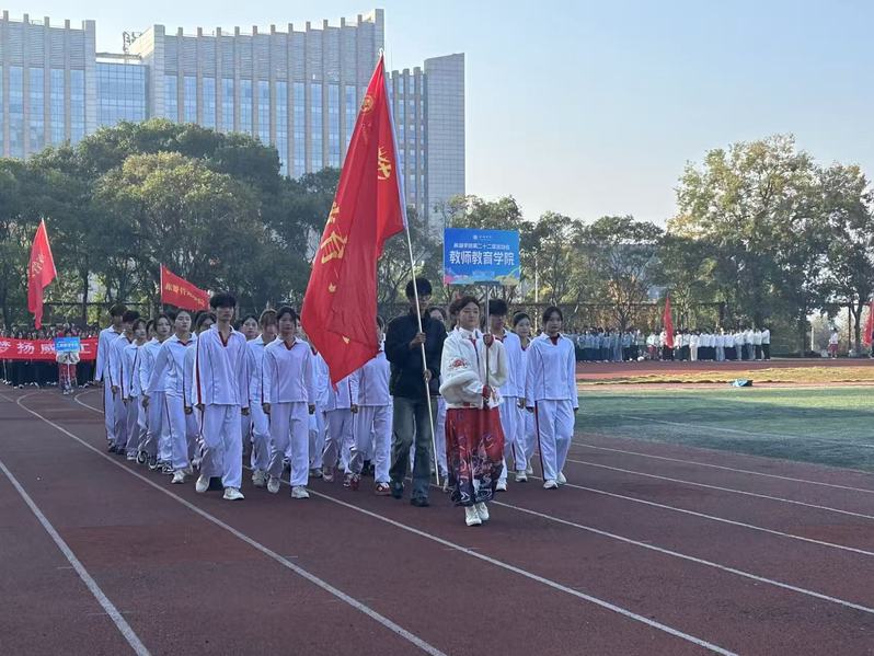 闪亮登场,尽显风采。11月5日开幕式上,教师教育学院方阵成为一道亮丽的风景线。队员们身着统一服装,迈着整齐矫健的步伐通过主席台。方阵高呼“教院雄风,锐不可当;团结拼搏,再创辉煌!”的激昂口号,其昂扬的斗志与蓬勃的朝气赢得了全场师生的阵阵掌声。