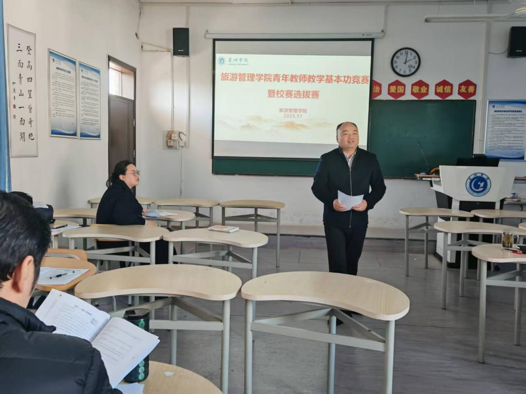 为锤炼青年教师教学基本功,提升课堂教学质量,2025年11月19日,旅游管理学院成功举办青年教师教学基本功竞赛暨校赛选拔赛。全院共9名青年教师参加比赛,院教学指导委员会成员担任评委,比赛由副院长朱学同主持。